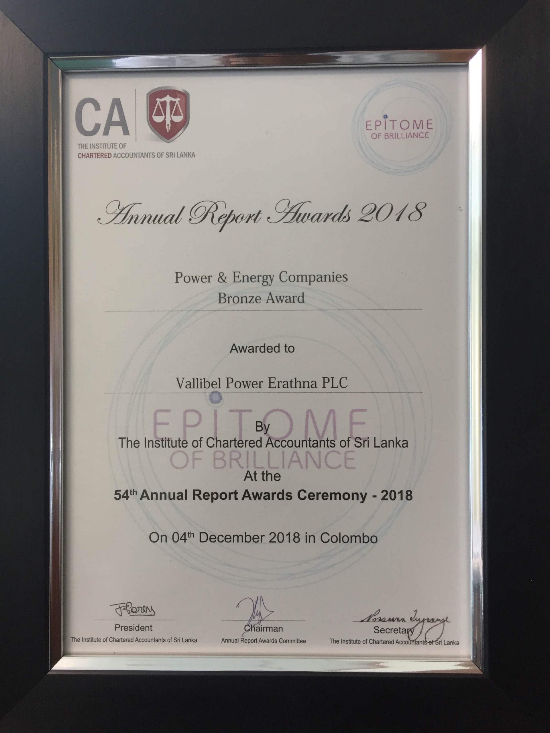 VPEL’s Integrated Annual Report-2017/18 was recognised the Bronze Award at the Annual Reports Awards 2018 under the category of Power and Energy Sector. The event organised by the Institute of Chartered Accountants of Sri Lanka (CA Sri Lanka) was held on 04th December, 2018 at the Shangri-La Hotel, Colombo under the patronage of the Governor of Central Bank Dr. Indrajit Coomaraswamy.