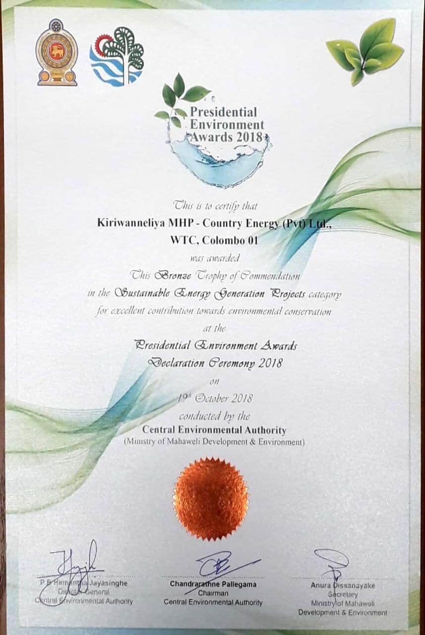Kiriwaneliya Mini Hydro Power Project has won the Bronze Award under the Sustainable Energy Generation Project category at the Presidential Environment Awards 2018. The award ceremony was organized by the Central Environment Authority in partnership with Ministry of Mahaweli Development & Environment on 19th October 2018.