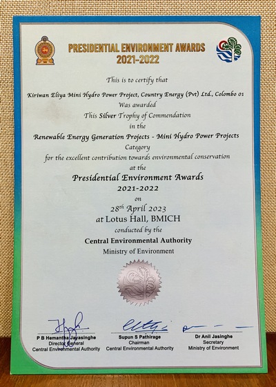 Our Kiriwaneliya Power Plant was honored to receive the Silver Award under Renewable Energy Project Category at the Presidential Environment Award Ceremony for year 2021-2022 organized by Central Environmental Authority (CEA). The ceremony was held at BMICH on April 28th, 2023.