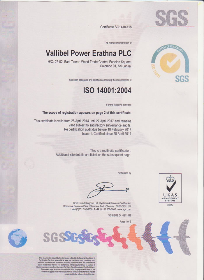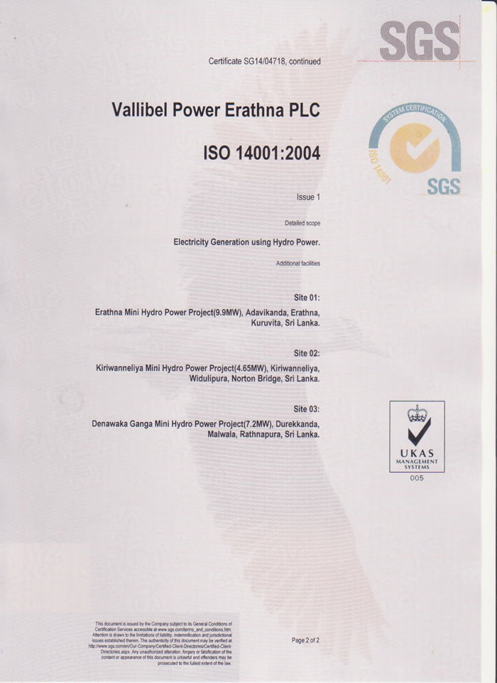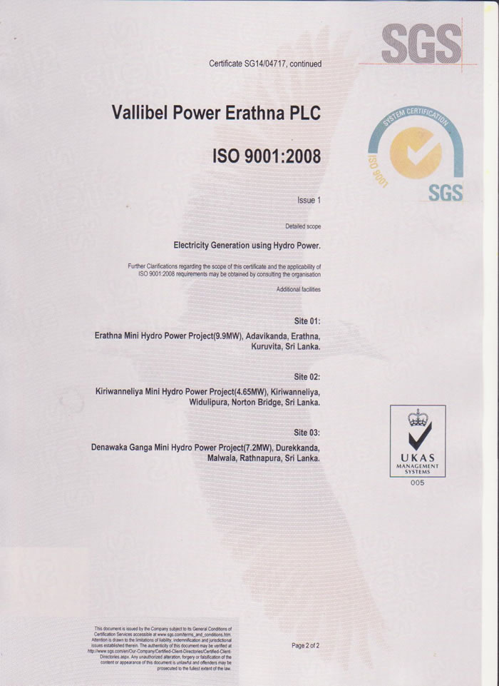 Vallibel Power Erathna PLC has been able to obtain ISO 9001:2008 and ISO 14001:2004 International Certificates for its successful implementation of Quality and Environmental Management Systems in all three power plants, namely, Erathna MHP, Denawaka MHP and Kiriwaneliya MHP. Two Certifications are valid from 28th April 2014 to 27th April 2017 subject to satisfactory annual surveillance audits. Company with its three power plants and head office were audited by SGS Lanka (Pvt) Ltd affiliating with SGS United Kingdom Limited to certify the processes with the international standards of International Organization for Standardization (ISO)