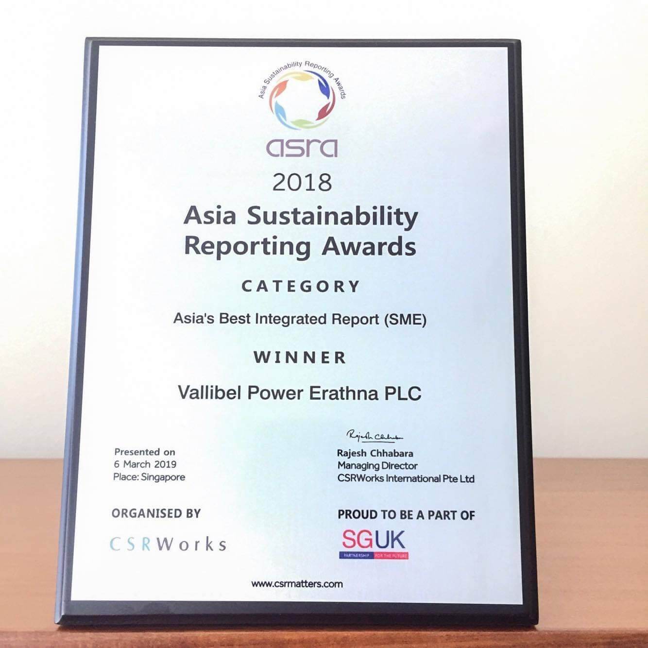 Singapore, 6 March: Vallibel Power Erathna PLC has won Asia’s best Integrated Report (SME) at the 4th Asia Sustainability Reporting Awards (ASRA) concluded in Singapore this evening. ASRA is the highest recognition for corporate reporting in the region.